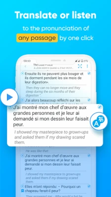 Hakanan kana da damar loda littattafai da labaran ka na Turanci zuwa cikin manhajar. Bugu da ƙari, za ka iya bincika kuma ka karanta duk wani littafi daga cikin tarin littattafan da aka riga aka samar a cikin manhajar. Ko Turanci, Faransanci, Jamusanci, Larabci, Sifanisanci, ko Rashanci, duk waɗannan harsunan waje za su zama masu sauƙin fahimta gare ka. "Parallel Translation" yana ba ka damar zurfafa fahimtar kalmomi ta hanyar mahallin su; Reverso Context zai nuna maka misalan jimloli masu amfani da kalmar da ka danna. Adana kalmomin da ba ka sani ba don sake dubawa, da faɗaɗa ƙamus ɗinka ba tare da wata wahala ba. Manhajar tana goyon bayan nau'ikan littattafai daban-daban ciki har da fb2 da epub, har ma da littattafan hoto, kuma tana da sauƙin amfani.